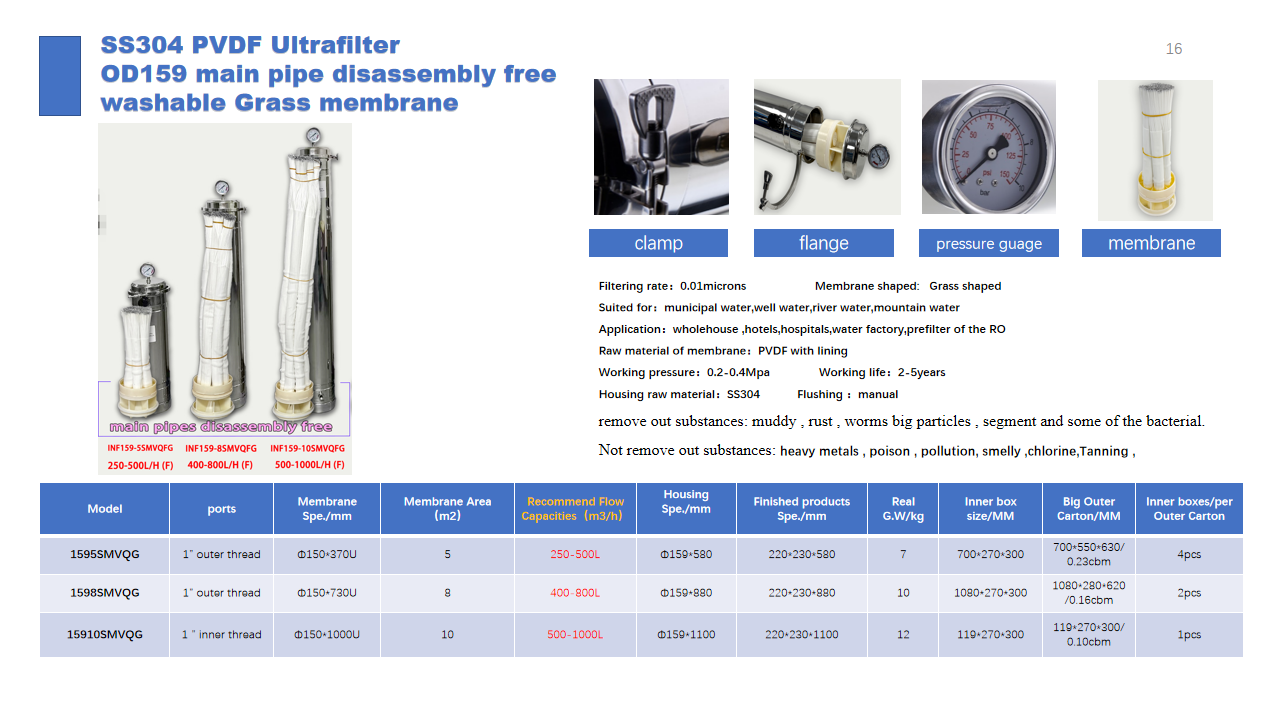 Our PVDF washable membrane filtering rate is 0.01Micron, The PVDF ultrafilter can only remove the muddy , rust , worms big particles , segment and some of the bacterial, make the cloudy water become transparent water , but it can not remove the heavy metals , poison , pollution, smelly ,chlorine,Tanning , if need to be solved these problems , need to add some other filters , such as carbon filter , or RO ,or chemicals filtration.